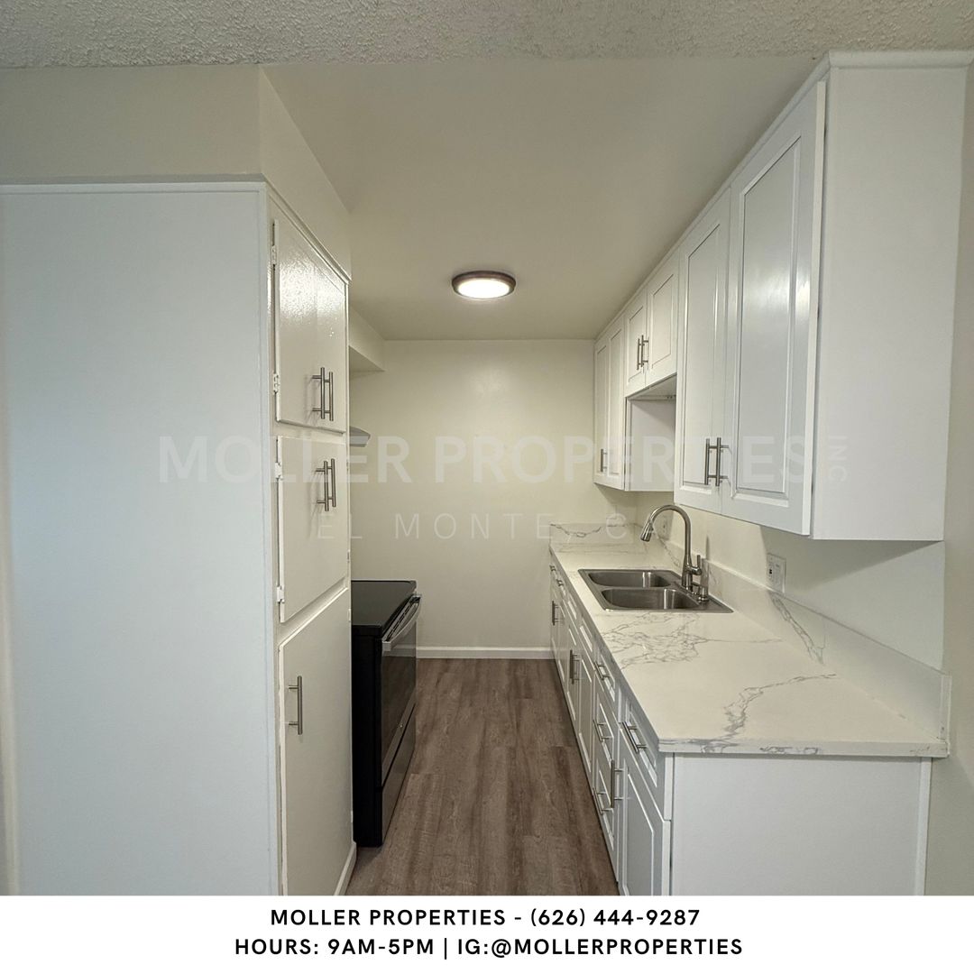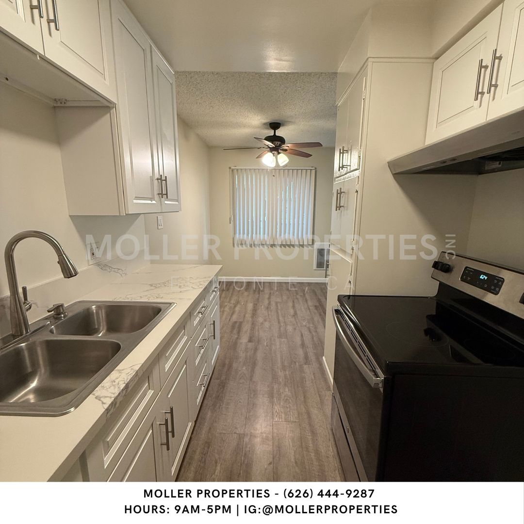 1 bedroom/1 bathroom, water and trash paid by owner. Beautiful apartment in central location between the 10 and 210 freeways. Beautiful hardwood style flooring, quarts counter tops, new cabinets, oven/stove combo included (not pictured), wall A/C unit and ceiling fans in Kitchen and bedroom, Lots of storage space. On-site manager, carport parking, swimming pool. Across the street from groceries, restaurants, close to West Covina Plaza, Eastland Shopping Center, and Ikea!
